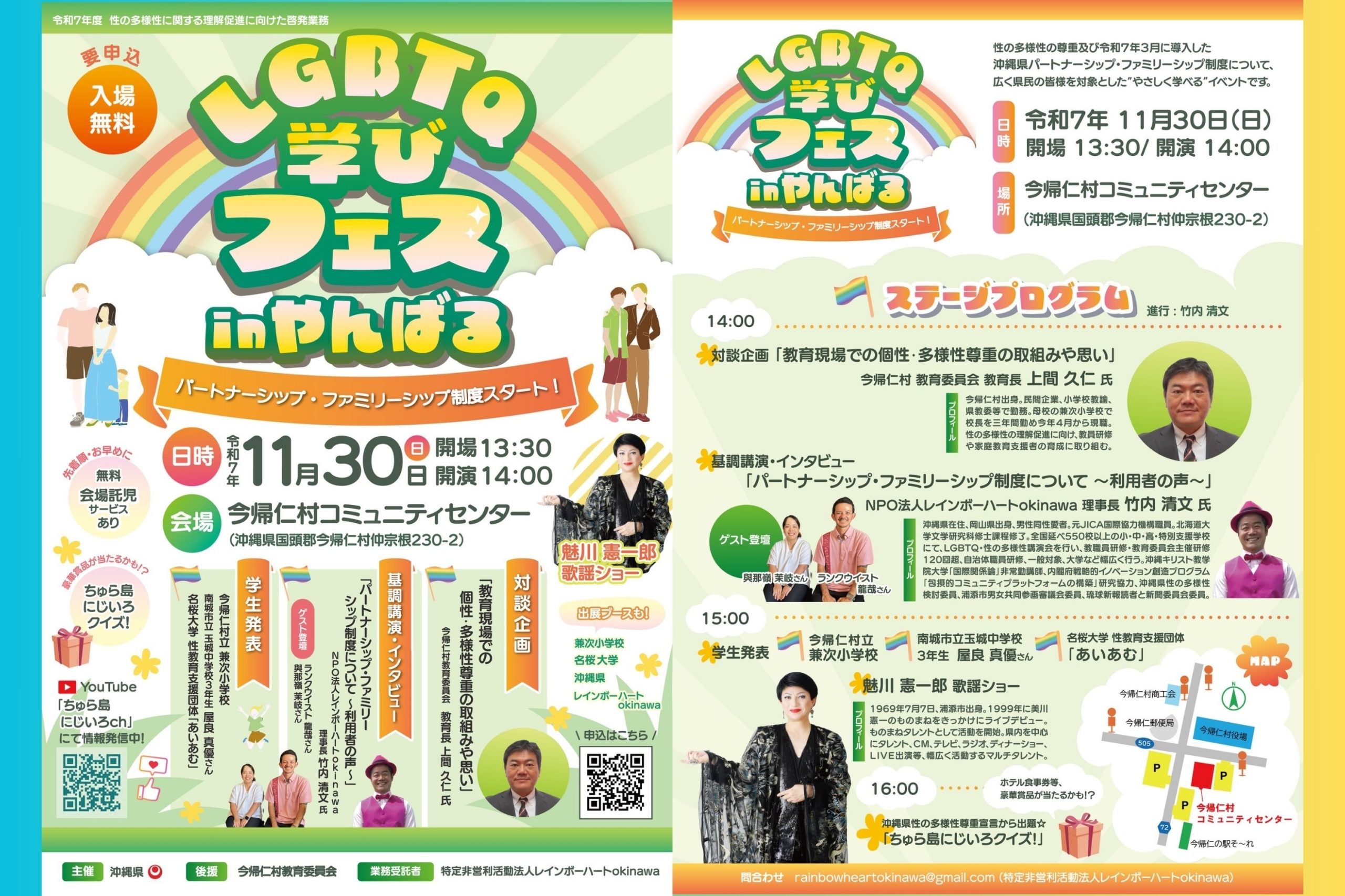 要申込、入場は無料です。無料の会場託児サービスあり、豪華賞品が当たるちゅら島にじいろクイズもございます‼︎